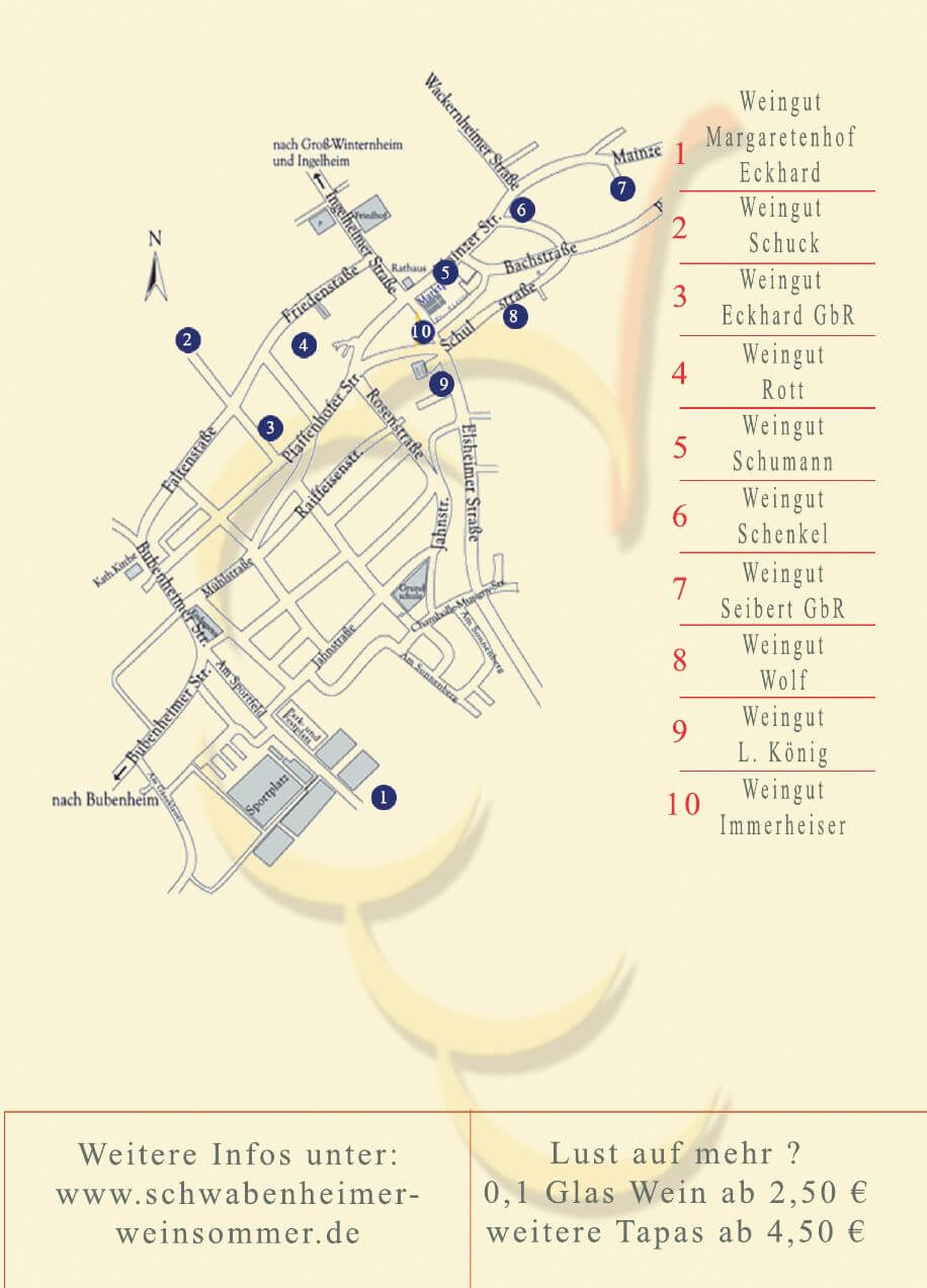 Vom zentralen Schwabenheimer Marktplatz erreichen Sie in einem Rundgang alle elf teilnehmenden Weingüter des Schwabenheimer Weinsommers. Bei den Winzern angekommen erwartet Sie eine Weinprobe mit Rheinhessen Tapas.